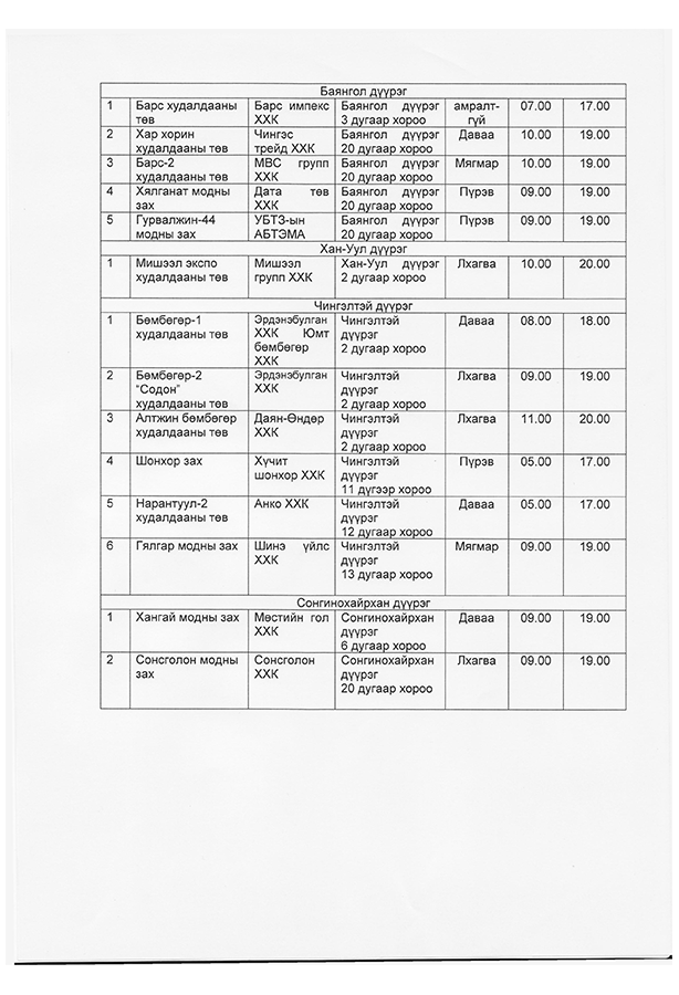 Цагийн хуваарьт өөрчлөлт оруулах талаар байгууллага, аж ахуйн нэгж, иргэдээс ирүүлсэн санал, хүсэлтийн дагуу Нийслэлийн Засаг дарга “Худалдаа үйлчилгээний газруудын цагийн хуваарьт өөрчлөлт оруулах” тухай А/505 дугаар захирамж гаргалаа. Захирамжаар авто замын дагуу байрлах худалдаа, үйлчилгээний газрын ажиллах цагийн хуваарьт өөрчлөлт орсон байна.