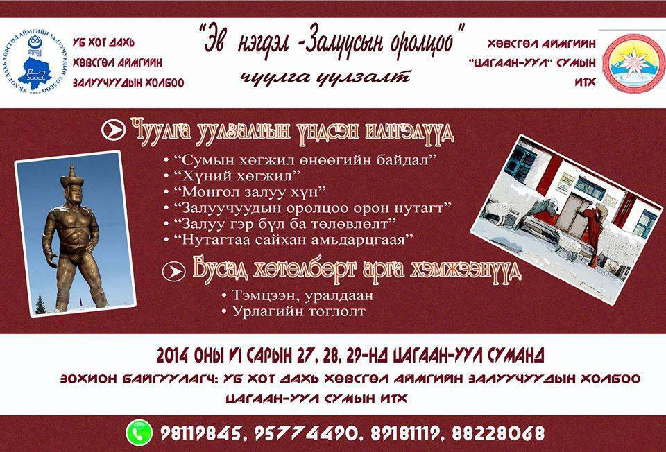 Монголын Залуучуудын Холбооны дэргэдэх Улаанбаатар хот дахь Хөвсгөл аймгийн Залуучуудын холбоо 2014 оныг Хөвсгөл аймгийн Залуучуудын Эв нэгдлийн жил болгон зарласан байна. Энэ хүрээнд “Оюуны элч” төсөл хөтөлбөрийг 3-р сараас эхлэн нийслэл хотноо хэрэгжүүлж эхлэсэн бөгөөд орон нутагт энэ сарын 27-оос “Эв нэгдэл-Залуусын оролцоо” чуулга уулзалтыг зохион байгуулах гэж байна. Чуулга уулзалт нь сум орон нутгийн хөгжилд залуучуудын хөгжлийн бодлого, төлөвлөгөөг тусгах, оролцоог нэмэгдүүлэх, орон нутгийн хөгжилд залуучуудын бодит оролцоог бий болгох, хамтдаа хөгжих гэсэн зорилготой юм.