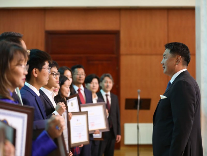 Монгол Улсын Ерөнхийлөгч Ухнаагийн Хүрэлсүх оюун ухааны дэлхийн дэвжээнд онцгой амжилт гаргаж, эх орныхоо нэрийг өндөрт өргөсөн сурагчид, удирдан бэлтгэсэн багш нарт нэрэмжит шагналаа гардуулав.