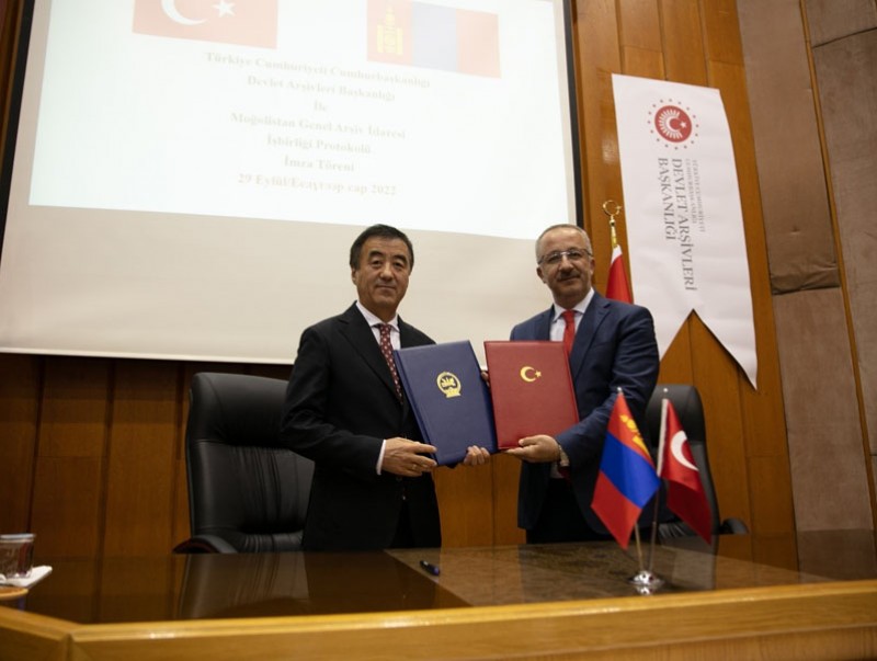 “Монгол Улсын Архивын ерөнхий газар болон Бүгд Найрамдах Турк Улсын Ерөнхийлөгчийн Тамгын газрын дэргэдэх Төрийн архивын ерөнхий газар хоорондын хамтын ажиллагааны протокол”-д Монгол Улсын Архивын ерөнхий газрыг төлөөлж Монгол Улсаас Бүгд Найрамдах Турк Улсад суугаа Онц бөгөөд Бүрэн эрхт Элчин сайд Г.Мөнхбаяр, БНТУ-ын Ерөнхийлөгчийн Тамгын газрын дэргэдэх Төрийн архивын ерөнхий газрын дарга Угур Унал нар 2022 оны 9 дүгээр сарын 29-ний өдөр Анкара хотноо гарын үсэг зурав.