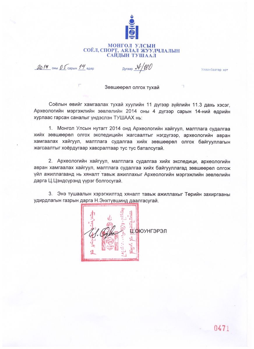 Соёл, спорт, аялал жуулчлалын сайд Ц.Оюунгэрэл 2014 онд ШУА-ийн Археологийн хүрээлэн, ХБНГУ-ын Боннын их сургуультай хамтран хэрэгжүүлэх “Хархорум”, Монголын Үндэсний музейгээс хэрэгжүүлэх “Хэрлэн” төслүүдэд археологийн хайгуул, малтлага судалгаа хийх зөвшөөрлийг олголоо.