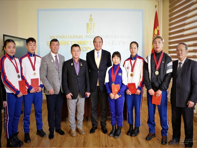 Монгол Улсын сайд, олимп, нийтийн биеийн тамир, спортын Үндэсний хорооны дарга Б.Бат-Эрдэнэ, Биеийн тамир, спортын улсын хорооны дарга Д.Жаргалсайхан нар самбо бөхийн насанд хүрэгч, залуучууд, өсвөр үе, сурагчдын ДАШТ-ээс алт, мөнгө, хүрэл медаль хүртсэн баг тамирчин, дасгалжуулагчдад хүндэтгэл үзүүлж, шагнаж урамшуулав.