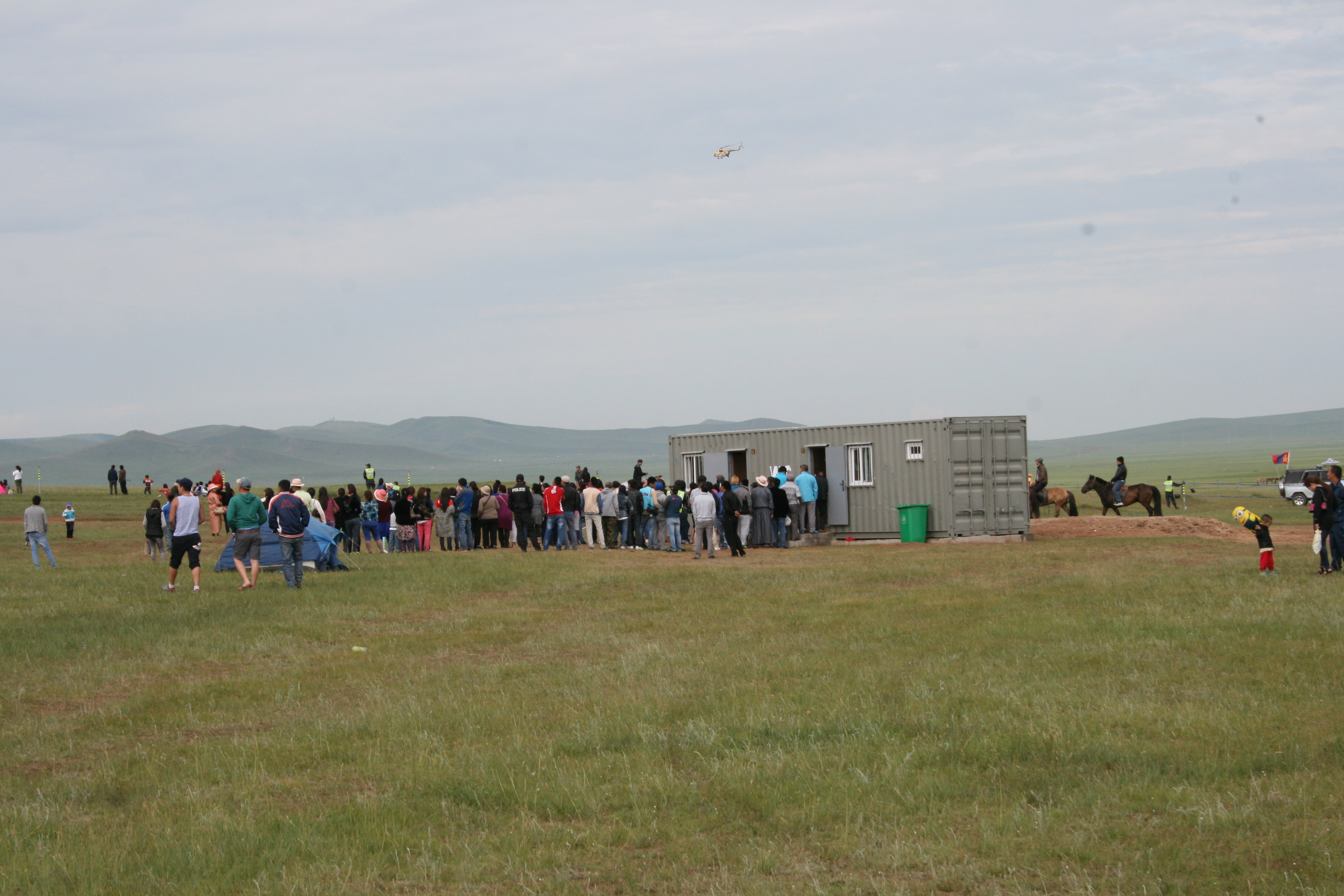 Жилийн жилд наадамчин түмний өмнө тулгардаг нэг бэрхшээл бол бие засах газар. Энэ жил ОО-ын тоог нэмж 11 цэгт ажиллуулсан ч ачаалал маш их иргэд 5-30 минут оочерлож байлаа. Бие засах газрын үнэ 200 төгрөг байсан ч усгүй, насос ажиллахгүй гэх мэт шалтгаанаар зөөврийн усаар цэвэрлэж ихэнх нь таагүй орчинд үйлчилгээ үзүүллээ. Иргэдийн зарим нь ”Зүгээр л олон жил хэрэглэж ирсэн модон жорлонгоо ажиллуулсан нь хамаагүй дээр” гэцгээж байв. Үнэндээ Хүй долоон худгийг тойрсон 1-2 км газарт уяачдын гэр, наадамчин олны майхан, малчин айлууд гээд хэдэн зуун гэр байрласан болохоор бие засах газрын асуудал маш хүнд байлаа.