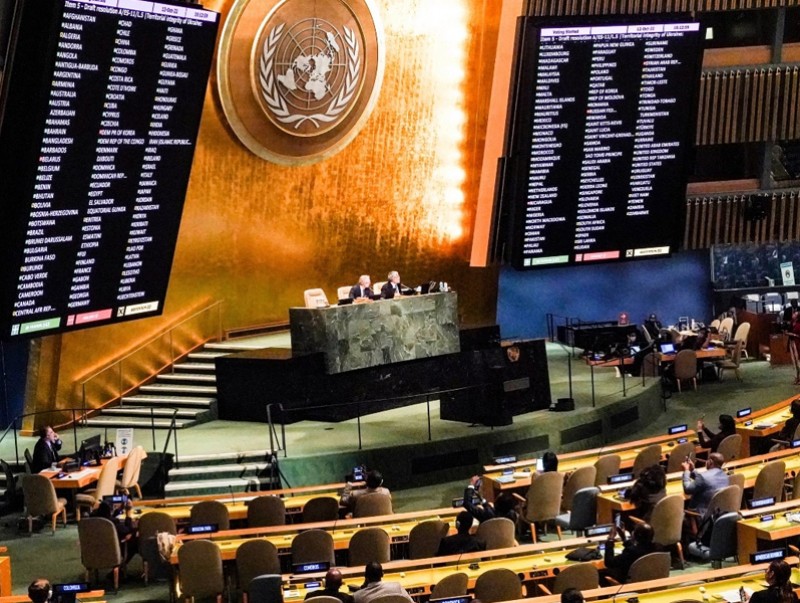 НҮБ-ын Ерөнхий Ассамблей өчигдөр тусгай чуулган хуралдуулж, Украины нутаг дэвсгэрээс ямар нэг нөхцөлгүйгээр цэргээ гаргахыг ОХУ-аас шаардсан тогтоол баталлаа. Оросын Украинд эхлүүлсэн дайныг зогсоож, энх тайван тогтоохыг шаардсан уг тогтоолыг НҮБ-ын гишүүн 141 улс дэмжиж, 7 улс эсрэг санал өгч, 32 улс санал хураалтад оролцохоос түдгэлзлээ. Хэдийгээр энэ тогтоолыг бүх улс дагаж мөрдөх үүрэг хүлээхгүй ч энэ бол Украины дайны нэг жилийн ойн өмнөхөн Оросыг хүч түрсэн дайнаа зогсоох ёстой гэсэн дэлхийн дийлэнх улсын нэгдмэл дуу хоолойг илэрхийлж байна. Олон улсын энх тайван, аюулгүй байдлыг сахин хамгаалах үүрэгтэй НҮБ-ын аюулгүйн зөвлөл Оросын хоригийн улмаас үүргээ гүйцэтгэж чадахгүй байгаа ийм үед Ерөнхий ассамблей л Украины дайныг зогсоохын төлөө дуу хоолойгоо чангаар илэрхийлэх болсон. Ерөнхий ассамблейн тогтоолууд нь Аюулгүйн зөвлөлийн тогтоолтой адил заавал дагаж мөрдөх хуулийн үндэслэлгүй боловч дэлхий нийтийн үзэл бодол хаашаа чигтэйг илтгэдэг хэмжүүртэй адил байдаг. ОХУ Украинд дайн эхлүүлснээс хойш Ерөнхий Ассамблей дайныг зогсоохыг шаардсан 5 тогтоол баталсан.