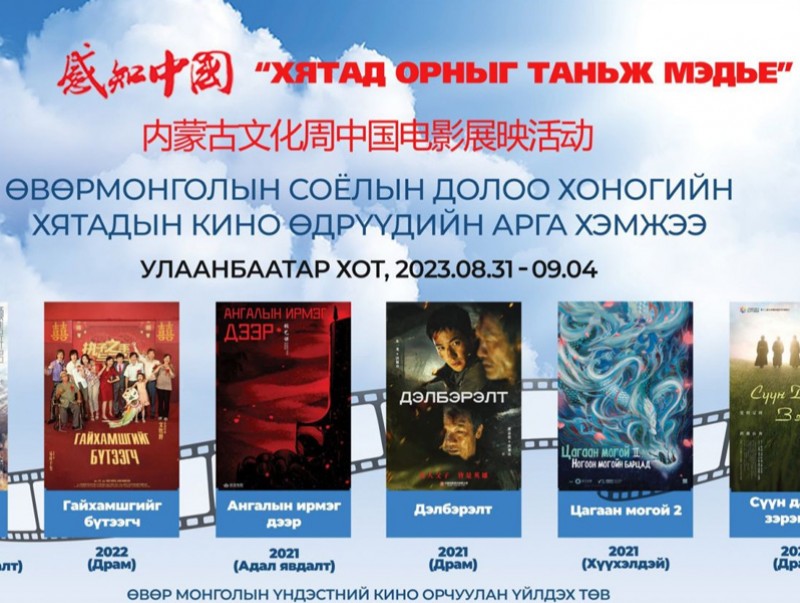 Өвөр Монголын соёлын 7 хоногийн Хятадын кино өдрүүд арга хэмжээ "Хятад орныг таньж мэдье" нэрийн дор эхэллээ. Уг арга хэмжээний хүрээнд 5 киног монгол дуу оруулгатайгаар наймдугаар сарын 31-ээс есдүгээр сарын 4-ний өдрүүдэд "Тэнгис" кино театрт үнэ төлбөргүй толилуулах ажээ.