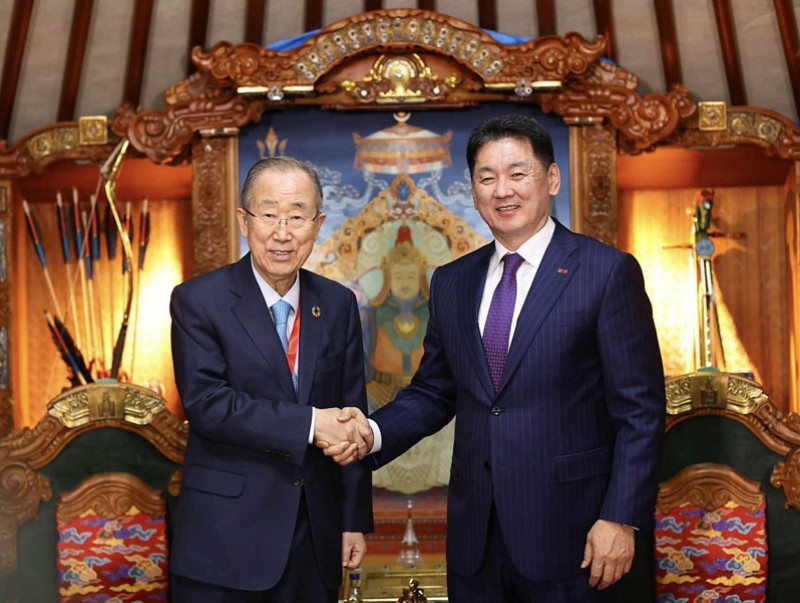 Монгол Улсын Ерөнхийлөгч Ухнаагийн Хүрэлсүх “Тогтвортой байдлын яриа хэлэлцээ 2025 – Уур амьсгалын өөрчлөлт: Тэрбуман мод” чуулга уулзалтад оролцож буй НҮБ-ын 8 дахь Ерөнхий нарийн бичгийн дарга, “Бан Ги Мүн” сангийн тэргүүн, “Чингис хаан” тэргүүн зэргийн одонт Бан Ги Мүн-ийг хүлээн авч уулзлаа.