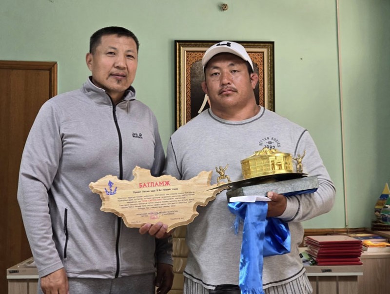 Тэрбээр өнөөдөр МҮБХ-ны Гүйцэтгэх захирал, Улсын гарди И.Доржсамбуугаас өргөмжлөл, Монгол бөхийн өргөөний сувинер, мөнгөн шагналаа гардаж авлаа гэж Монголын Үндэсний Бөхийн Холбооноос мэдээллээ.