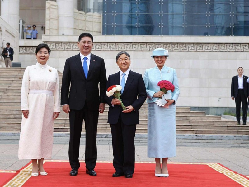 Монгол Улсын Ерөнхийлөгч Ухнаагийн Хүрэлсүх, гэргий Лувсандоржийн Болорцэцэгийн хамт Япон Улсын Цог Жавхлант Эзэн Хаан Нарүхито, Эрхэм дээд Хатан Масако нарыг Д.Сүхбаатарын талбайд албан ёсоор угтан авлаа.