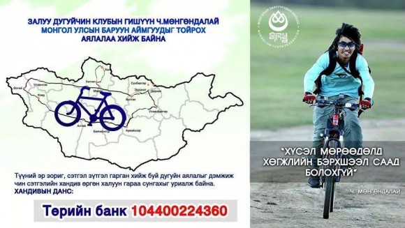 Баруун аймгуудаар 5500 км унадаг дугуйтай аялах Ч.Мөнгөндалай одоогоор Хөвсгөл аймгийн нутаг дэвсгэрт явж байгаа бөгөөд Улаан-Уул сумын Өгийн даваан дээр унадаг дугуй нь эвдэрсэн байна. Ямартай ч дугуйгаа түрсээр аймгийн төв дээр ирсэн бөгөөд засч чадаагүй байна гэсэн мэдээллийг бидэнд ирүүллээ. Монголын Залуучуудын Холбоо орон нутаг дахь салбар холбоодтойгоо холбоо барьж Улаанбаатарт ирэх хүртэл нь замд нь хүлээн авч хооллож, хонох орон байр олж өгөхөөр болсон байна.