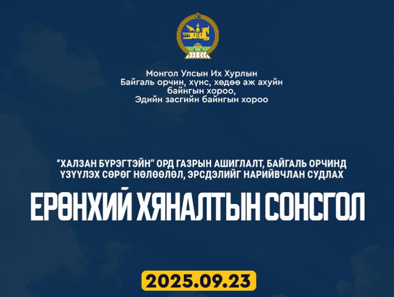Монгол Улсын Их Хурлын Байгаль орчин, хүнс, хөдөө аж ахуйн байнгын хороо, Эдийн засгийн байнгын хорооноос “Халзан бүрэгтэйн” орд газрын ашиглалт, байгаль орчинд үзүүлэх сөрөг нөлөөлөл, эрсдэлийг нарийвчлан судлах Ерөнхий хяналтын сонсголыг маргааш буюу 2025 оны есдүгээр сарын 23-ны өдөр иргэн, хуулийн этгээд, хэвлэл мэдээллийн байгууллагын төлөөллийн оролцоотойгоор Төрийн ордны “Их Эзэн Чингис хаан” танхимд зохион байгуулна.