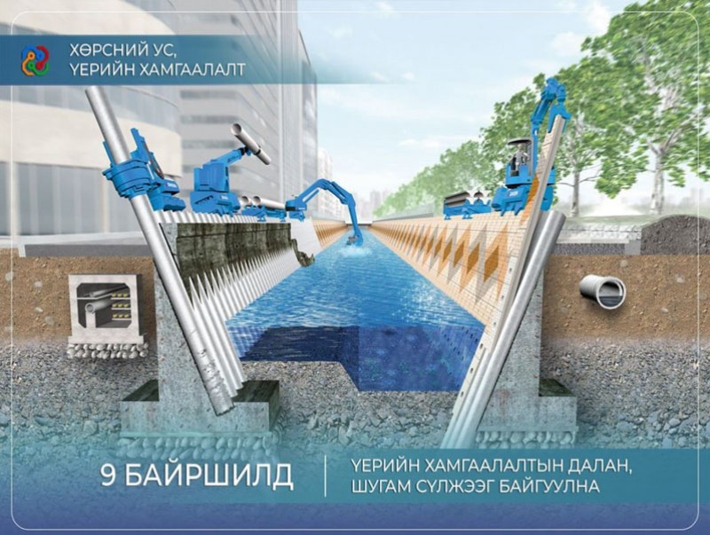 Төслийн хүрээнд үерийн хамгаалалтын барилга байгууламж болон борооны ус зайлуулах төв магистраль шугам баригдана.