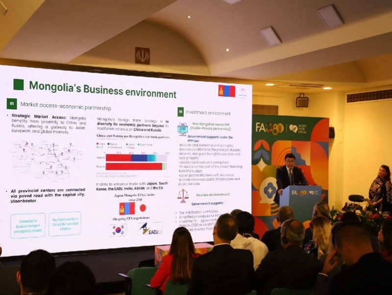 Хүнс, хөдөө аж ахуй, хөнгөн үйлдвэрийн яамны Төрийн нарийн бичгийн дарга Т.Жамбалцэрэн НҮБ-ын Хүнс, хөдөө аж ахуйн байгууллага (ХХААБ)-ын Итали Улсын Ром хот дахь төв байранд зохион байгуулагдсан “Гараас гарт” хөрөнгө оруулалтын форумын үеэр Монгол Улсын Хүнс, хөдөө аж ахуйн хөрөнгө оруулалтын төлөвлөгөөг танилцууллаа.
