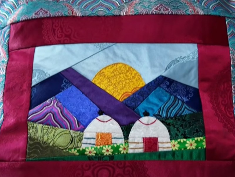 | Даавуугаар хийдэг зүймэл урлалыг торгоор хийж, Монгол ахуй шингэсэн бүтээл урлаж байна | ||