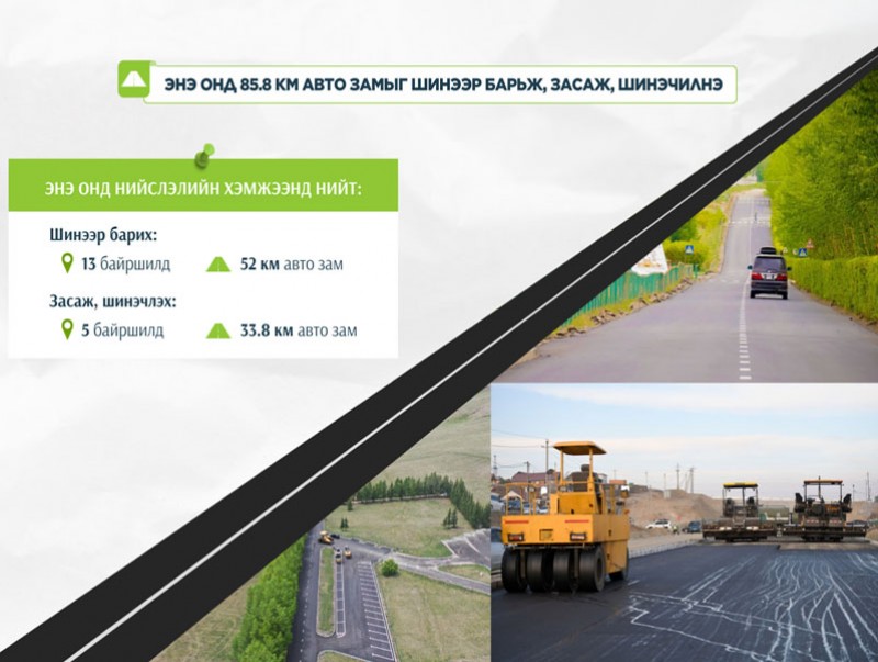Таван байршилд 33.8 км авто замын засвар, шинэчлэлт хийнэ. Нийт 85.8 км авто зам, замын байгууламжийг шинээр барьж, засаж, шинэчлэх юм.