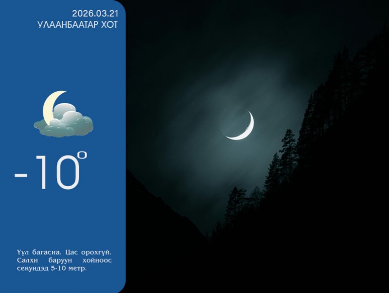 УЛААНБААТАР ХОТ ОРЧМООР: Шөнөдөө үүл багасна, цас орохгүй. Өдөртөө их төлөв цэлмэг. Салхи баруун хойноос секундэд 5-10 метр. Шөнөдөө Яармаг-Сонгины орчмоор 13-15 хэм, бусад хэсгээр 8-10 хэм хүйтэн, өдөртөө 6-8 хэм дулаан байна.