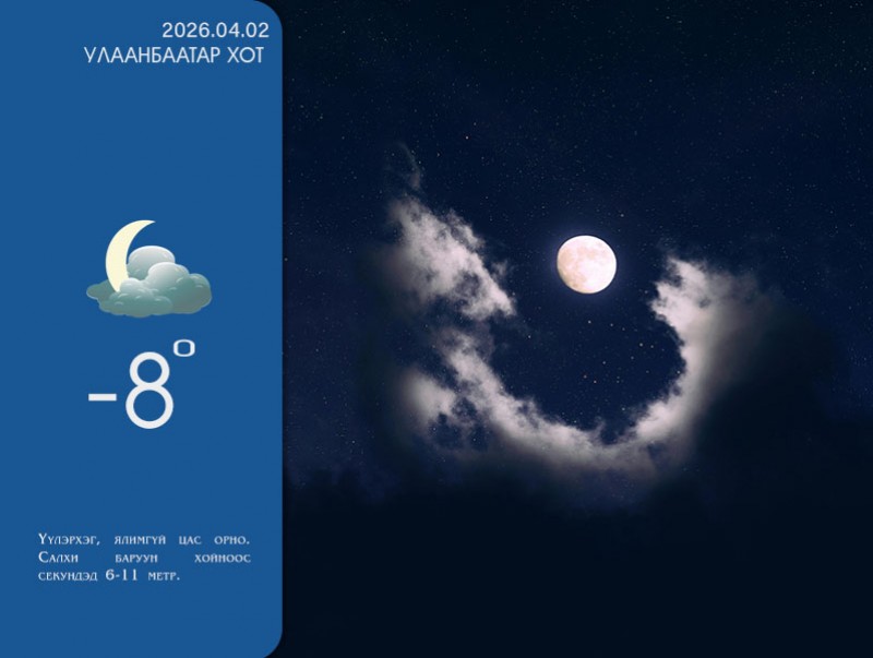 УЛААНБААТАР ХОТ ОРЧМООР: Шөнөдөө үүлэрхэг, ялимгүй цас орно. Өдөртөө үүл багасна, хур тунадас орохгүй. Салхи баруун хойноос секундэд 6-11 метр. Шөнөдөө Яармаг-Сонгины орчмоор 10-12 хэм, бусад хэсгээр 6-8 хэм хүйтэн, өдөртөө 6-8 хэм дулаан байна.