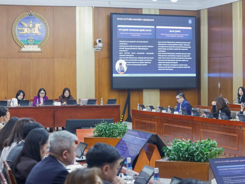 Түүнчлэн өнөөдрийн хэлэлцүүлэгт Төрийн өмчийн бодлого, зохицуулалтын газраас “Төрийн болон орон нутгийн өмчийн ангилал, удирдлагатай холбоотой өнөөгийн нөхцөл байдал, тулгамдаж буй асуудал” сэдвээр мэдээлэл хийв. Төрийн нийтийн өмчид иргэдэд өмчлүүлснээс бусад газар; газрын хэвлий, түүний баялаг; ой, түүний дагалдах баялаг; ус, түүний доторх баялаг; ургамал, ан амьтны нөөц; түүх, соёлын үнэт цогцолбор, хөшөө дурсгал; археологийн болон палеонтологийн олдвор; хуулиар нийтийн зориулалтаар ашиглахаар тогтоосон бусад эд хөрөнгө багтдаг. Харин төрийн өөрийн өмчид төрийн байгууллага, албан газарт эзэмшүүлсэн эд хөрөнгө, төрийн өмчит үйлдвэрийн газарт эзэмшүүлсэн эд хөрөнгө, төрийн өмчийн оролцоотой аж ахуйн нэгжийн төрд ногдох хувь хөрөнгө, улсын төсвийн хөрөнгө болон төрийн бусад тусгай сан, төрийн тусгай хэрэгцээний бэлтгэл нөөц, хуульд заасан бусад төрийн болон орон нутгийн өмчит төрөлжсөн мэргэшлийн эмнэлэг, нэгдсэн эмнэлгийн үл хөдлөх болон хөдлөх хөрөнгө хамаарч байна.