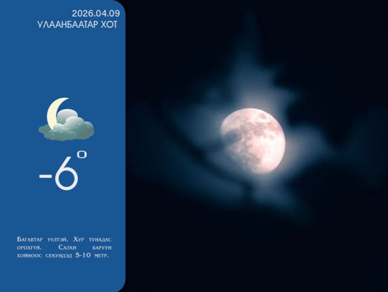 УЛААНБААТАР ХОТ ОРЧМООР: Багавтар үүлтэй. Хур тунадас орохгүй. Салхи баруун хойноос секундэд 5-10 метр. Шөнөдөө 4-6 хэм хүйтэн, өдөртөө 7-9 хэм дулаан байна.