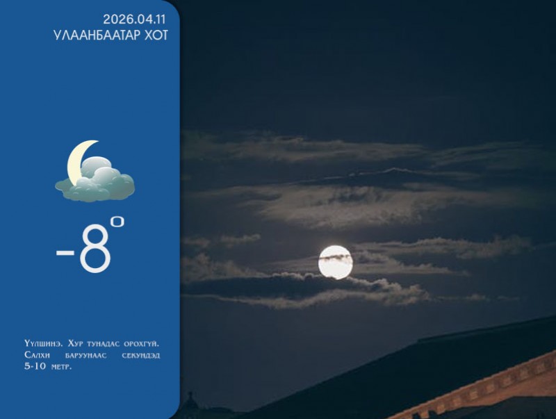 УЛААНБААТАР ХОТ ОРЧМООР: Үүлшинэ. Шөнөдөө хур тунадас орохгүй, өдөртөө ялимгүй хур тунадас орно. Салхи баруунаас секундэд 5-10 метр, өдөртөө зарим үед секундэд 12-14 метр хүрч ширүүснэ. Сэрүүсэж, шөнөдөө Яармаг-Сонгины орчмоор 9-11 хэм, бусад хэсгээр 6-8 хэм хүйтэн, өдөртөө 1-3 хэм дулаан байна.