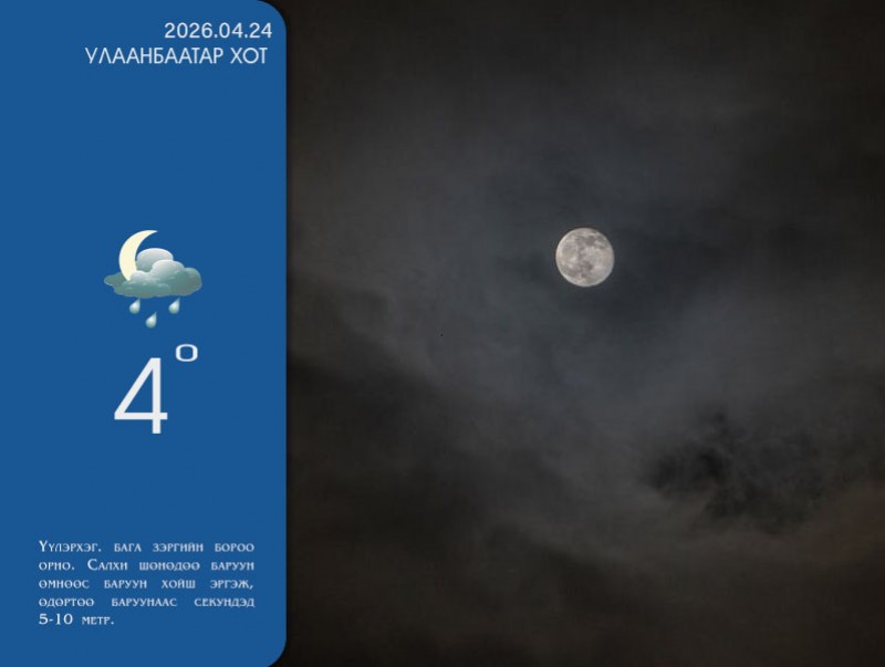 УЛААНБААТАР ХОТ ОРЧМООР: Шөнөдөө үүлэрхэг, бага зэргийн бороо орно. Өдөртөө үүл багасаж, хур тунадас орохгүй. Салхи шөнөдөө баруун өмнөөс баруун хойш эргэж, өдөртөө баруунаас секундэд 5-10 метр. Шөнөдөө 2-4 хэм, өдөртөө 11-13 хэм дулаан байна.