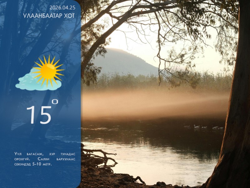 2026 оны дөрөвдүгээр сарын 25-ны 08 цагаас 20 цаг хүртэл: Ихэнх нутгаар солигдмол үүлтэй. Баруун аймгуудын нутгийн баруун өмнөд хэсэг, зүүн аймгуудын нутгийн зарим газраар хур тунадас орно. Бусад нутгаар хур тунадас орохгүй. Салхи ихэнх нутгаар баруун хойноос секундэд 5-10 метр, говь, тал, хээрийн нутгаар секундэд 12-14 метр хүрч ширүүснэ. Хэнтийн уулархаг нутаг, Туул, Тэрэлж, Онон, Улз, Халх голын хөндий, Дорнод-Дарьгангын тал нутгаар 9-14 хэм, Их нууруудын хотгор, Хангайн нурууны өвөр бэл, Орхон голын сав газар, говийн бүс нутгийн өмнөд хэсгээр 18-23 хэм, бусад нутгаар 13-18 хэм дулаан байна.