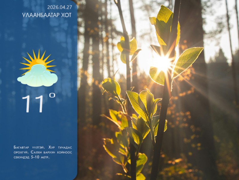 УЛААНБААТАР ХОТ ОРЧМООР: Багавтар үүлтэй. Хур тунадас орохгүй. Салхи баруун хойноос секундэд 5-10 метр. 9-11 хэм дулаан байна.