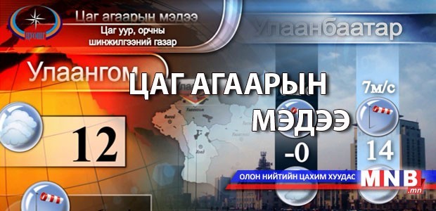 УЛААНБААТАР ХОТ: Үүлшинэ. Хур тунадас орохгүй. Салхи баруунаас баруун хойш эргэж секундэд 6-11 метр. 12-14 хэм дулаан байна.