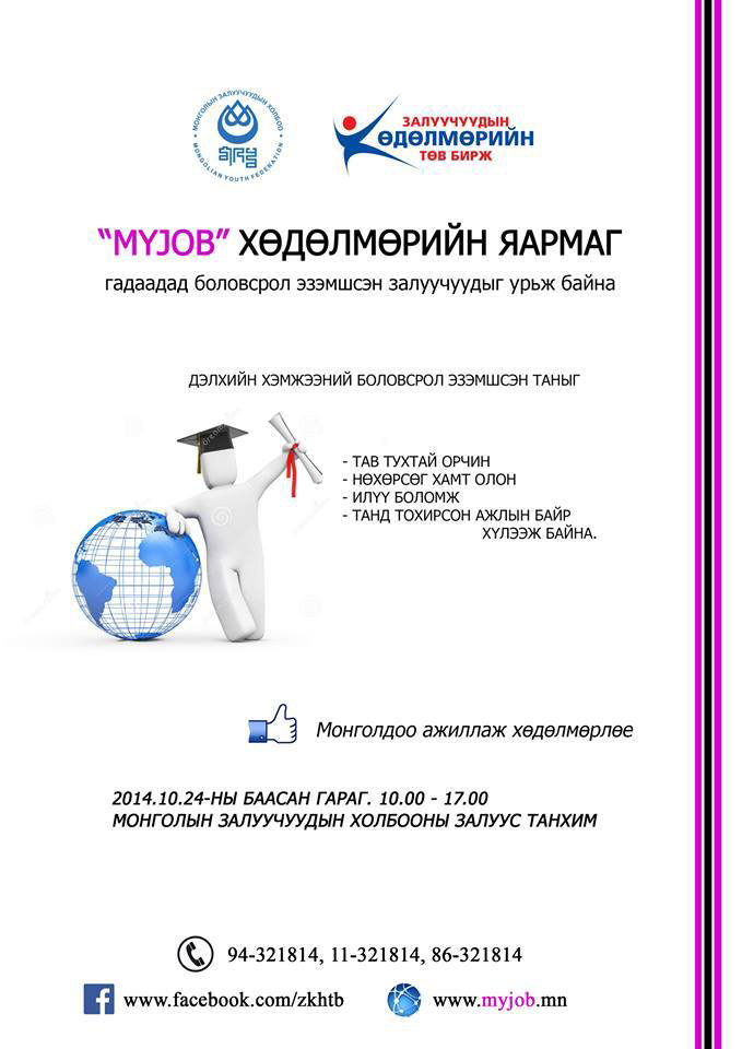 Иймд Дэлхийн хэмжээний боловсрол эзэмшсэн, чадварлаг боловсон хүчин хайж байгаа аж ахуйн нэгж байгууллагууд болон Монголдоо ирээд удаагүй байгаа гадаадад төгсөгч оюутан залуучуудад “MY JOB” хөдөлмөрийн яармагийн үүд хаалга нээлттэй байх болно гэдгийг дуулгалаа. Хөдөлмөрийн яармаг 2014.10.24-ний Баасан гарагт МЗХ-ны “Залуус танхимд” 10.00-17.00 цагийн хооронд зохион байгуулагдах юм байна.