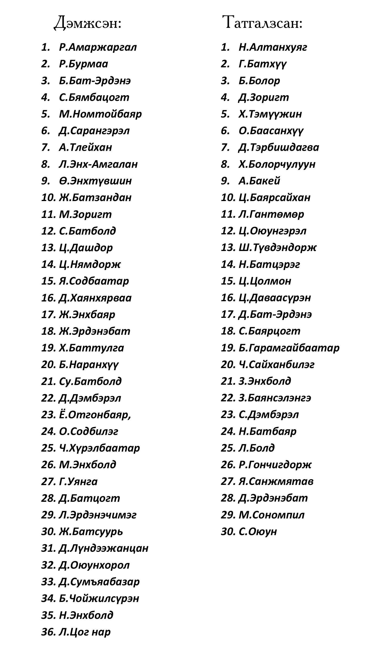 Ерөнхий сайдыг албан тушаалаас нь огцруулах чуулганы хуралдаан дөнгөж сая болж өнгөрлөө. Чуулганы хуралдаанд Ерөнхий сайдыг суудлаас нь унагах саналыг хэн зөвшөөрч, хэн татгалзсан талаарх мэдээллийг хүргэж байна. Н.Алтанхуягийг суудлаас нь буулгах саналыг:
