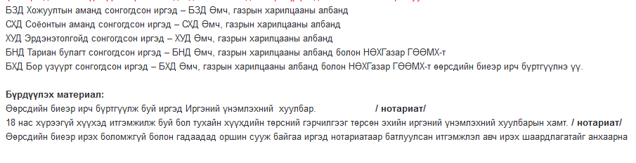 Гэр бүлийн зориулалтаар нийслэлийн 52 байршилд газар өмчлүүлэхээр болсон билээ. Одоогоор эхний таван байршлийг зарлаж, өмчлүүлээд байгаа бөгөөд хамгийн сүүлийн буюу тавдугаар ээлжинд газар өмчлөх эрхтэй болсон иргэдийн эрхийг энэ сарын 7-ны өдрийг хүртэл баталгаажуулна гэдгийг нийслэлийн өмчийн харилцааны газраас мэдээллээ. Хэдийгээр сугалаагаар газар өмчлөх эрх нь нээгдсэн ч өмчлөх эрхээ өөрийн биеэр очиж баталгаажуулахгүй бол тухайн эрх хүчингүй болох аж. Өмчлөх эрх нь үүссэн ч баталгаажуулж амжаагүй байгаа иргэд дараах байдлаар бүртгүүлж болох юм.