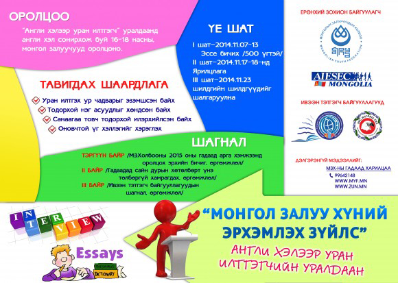 | Залуусаа “Англи хэлээр уран илтгэгч”-ийн тэмцээнд урьж байна | ||