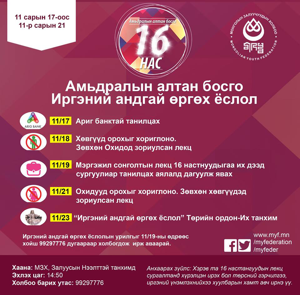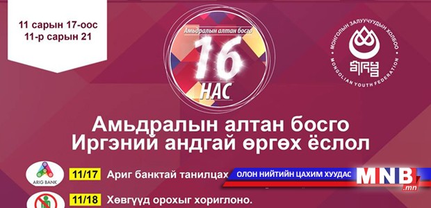 МЗХ-оос 16 настнуудаа өлгийдөн авах, амьдралд хөл тавихад нь зөв чиглүүлэх үүднээс арваннэгдүгээр сарыг тэдний нэрэмжит сар болгон зарласнаас хойш маш олон ажлууд зохион байгуулагдаад байна. Байгууллагуудтай танилцах аялал, лекц сургалт зохион байгуулах, мэргэжлээ хэрхэн зөв сонгох талаар ярилцах, хоорондоо найзлах, танилын хүрээгээ тэлэх сайхан боломжууд байлаа. Долоо хоног бүрийг үр бүтээлтэй өнгөрөөж байгаа 16 настнууд энэ долоо хоногт Ариг банктай танилцах, “Хөвгүүд орохыг хориглоно” зөвхөн охидод зориулсан лекц, Мэргэжил сонголтын лекц, Их дээд сургуулиар танилцах аялал, “Oхидууд орохыг хориглоно” зөвхөн хөвгүүдэд зориулсан лекц зохион байгуулагдах бөгөөд арваннэгдүгээр сарын 23-нд Монгол бахархлын өдөр, Их Эзэн Чингис Хааны мэндэлсэн өдөр Төрийн ордны Их танхимд “Иргэний андгай өргөх ёслол” зохион байгуулагдах юм.