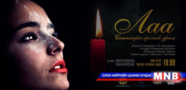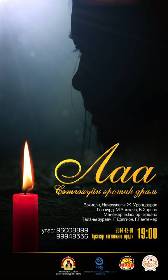 Олон Улсын ДОХ-ын эсрэг өдрөөр “Лаа ” сэтгэхүйн эротик драмын жүжиг тоглогдоно. Монголын Залуучуудын Холбооны дэргэдэх “Залуу эмэгтэйчүүд”-ийн клуб Олон Улсын ДОХ-ын эсрэг өдрийг тохиолдуулан үзэгчиддээ “Лаа ” сэтгэхүйн эротик драмын жүжгээ хүргэхээр төлөвлөн бэлтгэл ажилдаа оржээ. Энэхүү жүжгийн зохиолч, найруулагчаар Ж.Уранцацрал ажиллаж, гол дүрүүдэд М.Энхзаяа, Б.Тэлмэнпүрэв, Э. Мөнхдалай, Б.Хэрлэн нар тоглосон байна.