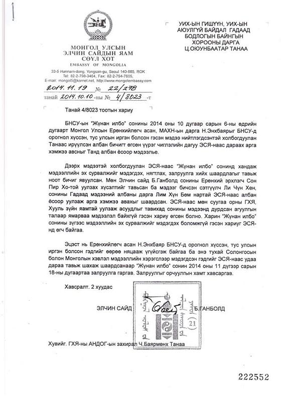 Тус залруулгад “Монгол Улсын гуравдагч Ерөнхийлөгч Н.Энхбаяр нь Солонгост орогнож буй гэсэн нь үндэслэлгүй болохыг залруулж байна” гэжээ. Монгол Улсаас БНСУ-д суугаа Элчин сайд Б.Ганболд Жүнан Илбо сониныхонтой уулзсан ба тус сонины зүгээс мэдээллийн эх сурвалжийг хэлэх боломжгүй гэдэг мэдээллийг өгсөн байна.