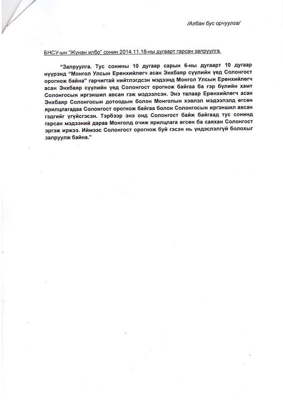 | Солонгосын “Жүнан илбо” сонин Н.Энхбаярын талаар ташаа мэдээлэл гаргаснаа залрууллаа | ||