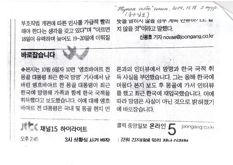 БНСУ-ын "Жүнан Илбо" сонины 2014 оны аравдугаар сарын 6-ны өдрийн дугаарт Монгол Улсын гуравдагч Ерөнхийлөгч Намбарын Энхбаярын БНСУ-д орогнол хүссэн, тус улсын иргэн болсон гэх мэдээллийг нийтлэж байсан. Тэгвэл тус сонин ташаа мэдээлэл нийтлэсэн талаараа өөрийн сонины арваннэгдүгээр сарын 18-ны дугаартаа залруулга гаргажээ.