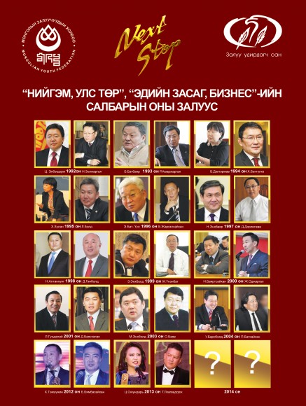 Тэгвэл МЗХ 2014 оны нийгэм, улс төр, эдийн засаг, бизнесийн салбарын нэр дэвшигчдийн нэрсийг эхний байдлаар ил болголоо. Эхний байдлаар гэдэг нь байгууллага болоод иргэд нэр дэвшүүлэх шилдэг залуучуудынхаа мэдээллийг МЗХ-нд ирүүлэх нь нээлттэй бөгөөд www.myf.mn сайтад тавигдсан нэр дэвшигчид өдөр ирэх бүр нэмэгдсээр байгаа нь харагдлаа.