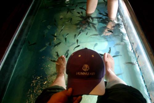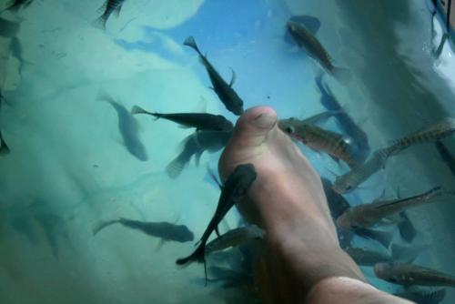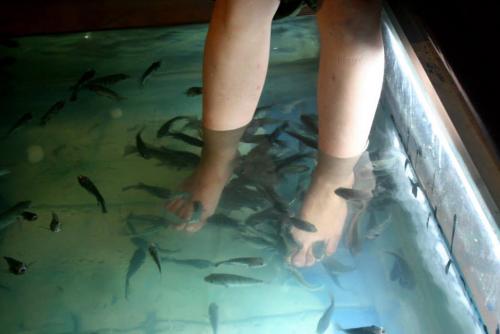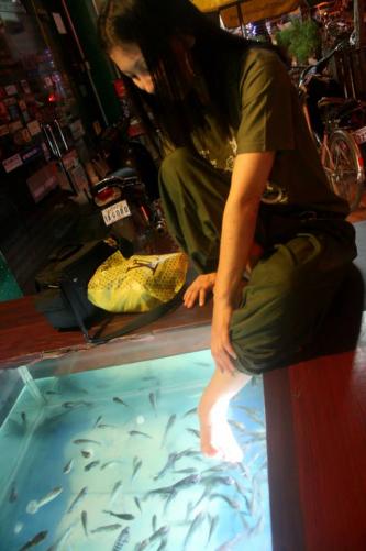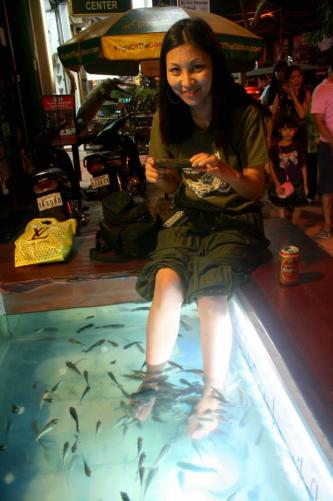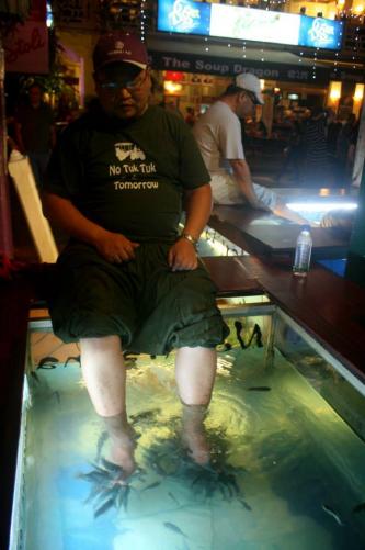 Янз бүрийн иллэг, массаж төрөл бүрийн гоо сайхны болон зугаацлын үйлчилгээ дүүрэн. Мэдээж дагаад биеэ үнэлэгчдийн арми ч ажиллаж байдаг болтой юм билээ. Хөгшин Европ, залуу камбож охин хөтөлсөн алхах нь энгийн л үзэгдэл. Аан нээрээ бид тэнд /хаа сайгүй бүх улсад байдаг юм шүү/ хөлөө загасанд “идүүлсэн”. Гудамжинд “Миний өлсгөлөн загаснуудыг өөрийн биеэр хооллоно уу?” гэсэн зар байвал акулны хоол болох нь гэж ойлгож болохгүй. Зүгээр л хөлний чинь илүүдэл, үхэжсэн арьснуудыг идэнгээ сүүпэр массаж хийдэг загаснуудыг хэлж байгаа юм. Их хямдхан. Хүний 3 доллар байсан. Бид хоёр ярьж байгаад 5 доллараар хоёулаа загас хооллов. Аан бас тэр 5 доллартаа хүн тус бүрт нэг пиав өгчихдөг юм. Загас хооллонгоо шар айраг шимсэн шиг сууна. Хажуугаар явж байгаа хүмүүс ямар байна. Өвдөж байна уу? Этр гэж асуугаад ОД болчихно оо бас...