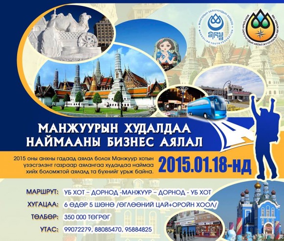 Энэ удаад Залуучуудын Аялал Жуулчлалын Хөгжлийн Төв шинэ оны анхны гадаад аяллаа МАНЖУУР ХОТ-ыг сонгон зорих гэж байна. БНХАУ-ын ӨМОЗ орны Хөлөнбуйр аймагт орших Манжуур хот нь сүүлийн жилүүдэд дэлхийн жуулчид болон худалдаа арилжааны голлох төв болон өргөжиж байгаатай холбогдуулан жилд дунджаар 4,5 сая жуулчин хүлээн авдаг томоохон ХОТ юм. Энэхүү аялалд оролцсоноор Манжуур хотын түүх соёл, мөсөн хотгон, музей, худалдаа наймааны газруудаар зочлох болон худалдаа хийх боломжтой аж. Мөн аяллын люкс зэрэглэлийн автобусаар зорчих ба 3-4 одтой зочид буудалд байрлах гэнэ. Тус аялал 2015 оны 01-р сарын 18-23-ны өдрүүдэд авто аялал хэлбэрээр зохион байгуулагдах бөгөөд Улаанбаатар хот - Дорнод аймаг - МАНЖУУР ХОТ - Дорнод аймаг - Улаанбаатар хот гэсэн маршрутаар аялах юм байна.