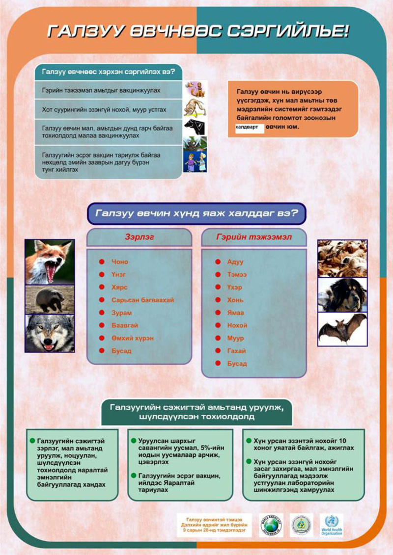 Дашрамд дурдахад, одоогоор Увс аймгаас гадна Өвөрхангайн Зүүнбаян-Улаан, Арвайхээр, Булган аймгийн Рашаант, Хэнтий аймгийн Жаргалтхаан, Төв аймгийн Баянцогт сумдад мал, амьтны галзуу өвчин бүртгэгдээд байна.