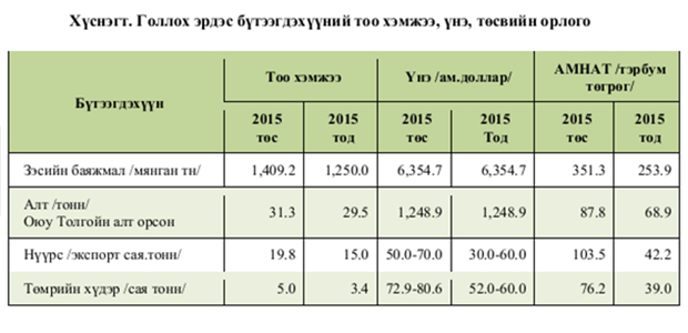 Манай улс энэ онд 20 сая тонн нүүрс 50-70 ам.доллараар экспортлохоор хуульчилсан. Гэвч дэлхийн зах зээлд нүүрсний үнэ сэргэх хандлагаүй байгаагаас гадна, урд хөрш түүхий нүүрсний хэрэглээг хумих бодлого явуулж байна. Манай урд хөрш өнгөрсөн оны арваннэгдүгээр сарын 17-нд австралитай “чөлөөт худалдааны хэлэлцээр” байгуулсан. Эдгээр нь манай нүүрсний өрсөлдөх чадварт сөргөөр нөлөөлж, уг түүхий эдийн экспорт өнгөрсөн оныхоос нэмэгдэхгүй байх эрсдэлийг дагуулж байгаа юм. Тиймээс энэ онд 15 сая тонн нүүрс, тонныг нь 30-60 ам.доллараар экспортлохоор төсвийн тодотголд тусгажээ. Үүнээс гадна дэлхийн зах зээлд төмрийн хүдэр болон цайрын үнэ үргэлжлэн буурч байгаа учраас манайхан үүнтэй уялдуулж үнийн төсөөллөө бууруулжээ.