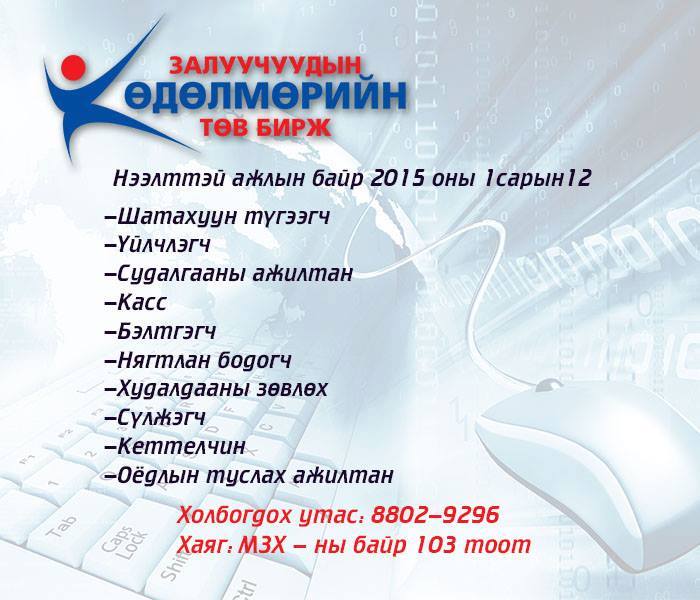 - Мэдээллийн ажилтан – 5 хүн байнга цаашдаа ажиллах боломжтой хүн
