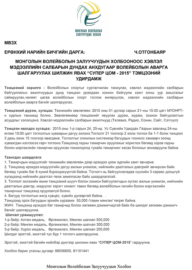 Монголын Волейболын Залуучуудын холбооноос хэвлэл мэдээллийн салбарын дундах Анхдугаар волейболын аварга шалгаруулах шилжин явах "Супер цом - 2015" тэмцээний удирдамж