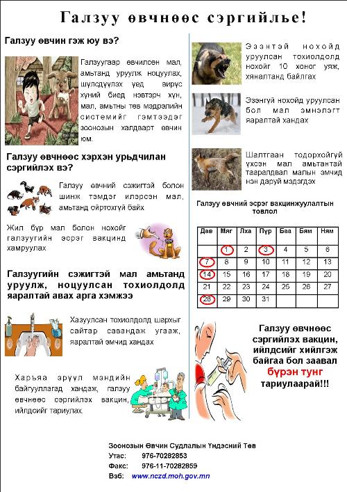 Говь-Алтай аймгийн Цээл сумын Зэгст багийн нутагт хоёр айлын нохой галзуу өвчнөөр өвчилсөн болох нь лабораторийн шинжилгээгээр батлагдсан байна. Нохойд уруулсан нэг хүн галзуу өвчний эсрэг вакцин, ийлдэс эмчилгээнд хамрагджээ.