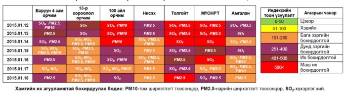 Энэ сарын 12-18-ны өдрүүдийн Нийслэлийн агаарын чанарын албаны мэдээгээр гэр хорооллын орчимд агаар “Их”, “Маш их”, хотын хэмжээнд “Бага зэргийн”, “Дунд зэргийн” бохирдолтой байсан аж. Нийслэлийн Зуун айл, Зурагт, Толгойтын орчимд агаарын бохирдол маш их байгаа бол 13 дугаар хороолол, Нисэх орчим харьцангуй бага байгаа гэнэ.
