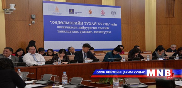 Хөдөлмөрийн тухай хуулийн шинэчилсэн найруулгын төслийг Хөдөлмөрийн сайд С.Чинзориг танилцуулсан. Одоогийн мөрдөгдөж буй Хөдөлмөрийн тухай хуулийг 1999 онд баталжээ. Үүнээс хойш 14 жилийн хугацаанд улс орны эдийн засаг, нийгмийн харилцаа, түүний дотор хөдөлмөр эрхлэлтийн харилцаанд зарчмын өөрчлөлтүүд гарч, шинэ хандлага, арга хэлбэр нэвтэрсээр байгаагаас үүдэн уг хуулийг эргэн харж, олон улсын хөдөлмөрийн хэм хэмжээ, өөрийн орны онцлог нөхцөл байдлыг харьцуулан өөрчлөх шаардлага тулгарсан байна. Тиймээс Хөдөлмөрийн яам, нийгмийн түншүүд болох Ажил олгогч эздийн нэгдсэн холбоо, Үйлдвэрчний эвлэлийн холбоо болон мэргэжлийн хуульчид, сонирхогч талуудын оролцоо, Олон улсын Хөдөлмөрийн байгууллагын техникийн туслалцаатайгаар Хөдөлмөрийн тухай хуулийн шинэчилсэн найруулгын төслийг боловсруулжээ. Нийт 13 бүлэг, 128 зүйлтэй уг хуулийн төсөлд хамтын хэлэлцээ, хөдөлмөрийн гэрээ, цалин хөлс, хөдөлмөрийн нөхцөл, норм, ажил амралтын цаг, зарим онцлог бүлгийн хөдөлмөр эрхлэлтийн харилцаа болон хөдөлмөр эрхлэлттэй холбоотой маргааны зохицуулалтыг тусгасан. Мөн хөдөлмөрийн дотоод журам, сахилга, эд хөрөнгийн хариуцлага, удирдлага, хяналттай холбоотой зохицуулалт, хууль тогтоомж зөрчсөн тохиолдолд хүлээх хариуцлага зэргийг тусгасан болохыг дэлгэрэнгүй танилцуулав. Хэлэлцүүлгийн үеэр Монголын Ажил олгогч эздийн нэгдсэн холбоо, Монголын Үйлдвэрчний эвлэлийн холбоо болон Олон улсын Хөдөлмөрийн байгууллагын зүгээс уг хуулийн төсөлтэй холбоотой байр сууриа илэрхийлсэн юм.