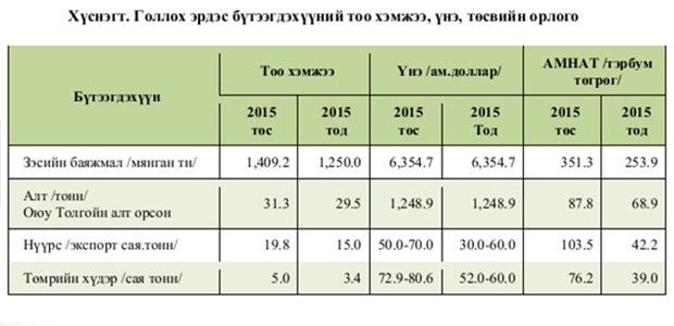 Эрдэнэт үйлдвэрийн тухайд өнгөрсөн онд 29 сая тонн хүдэр олборлож, 26 сая тонныг нь боловсруулсан байна. Үүнээс 690 мянган тонн баяжмал гарган авсан мэдээлэл байгаа юм. Ийнхүү “Эрдэнэт”, “Оюутолгой” нийлээд өнгөрсөн онд 1.2 сая тонн зэсийн баяжмал экспортлоод байна. Энэ оны тухайд уг хоёр үйлдвэр 1.4 сая тонн зэсийн баяжмал дэлхийн зах зээлд экспортолно гэж 2015 оны төсөвт тусгасан. Гэвч дэлхийн зах зээлд зэсийн эрэлт буурч магадгүй гэдэг үндэслэлээр экспортлохоор төлөвлөсөн хэмжээг 150 мянган тонноор бууруулахаар 2015 оны төсвийн тодотголын төсөлд тусгасан байна.