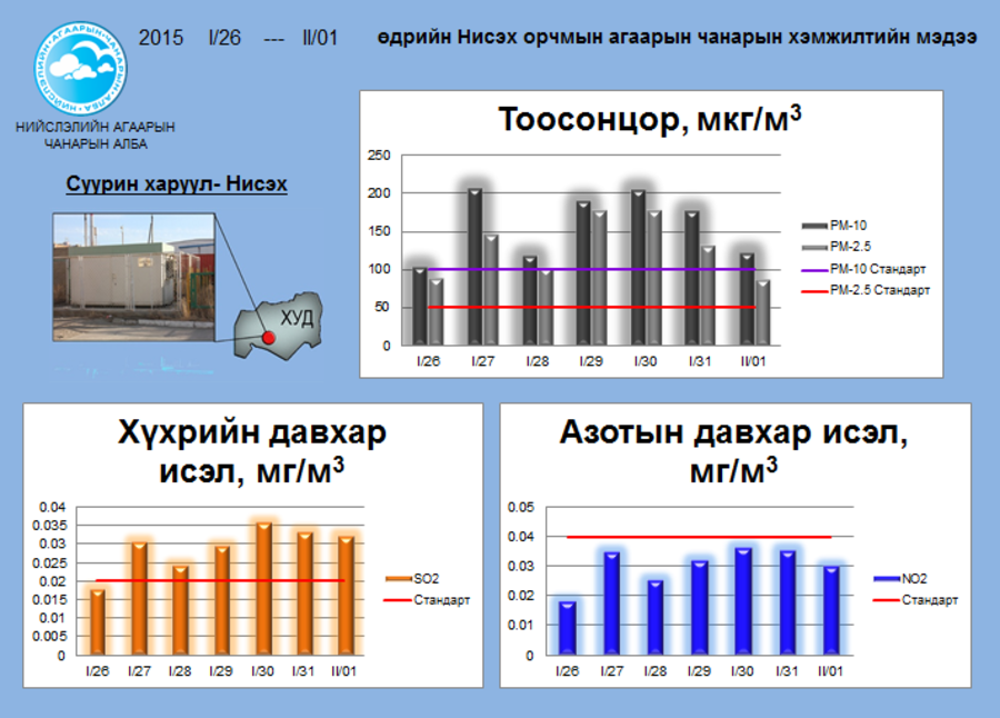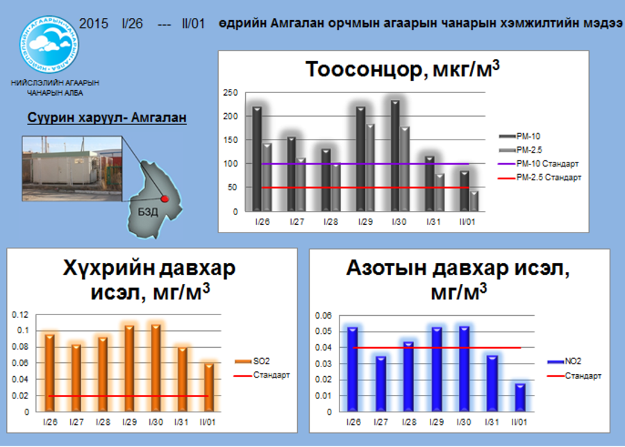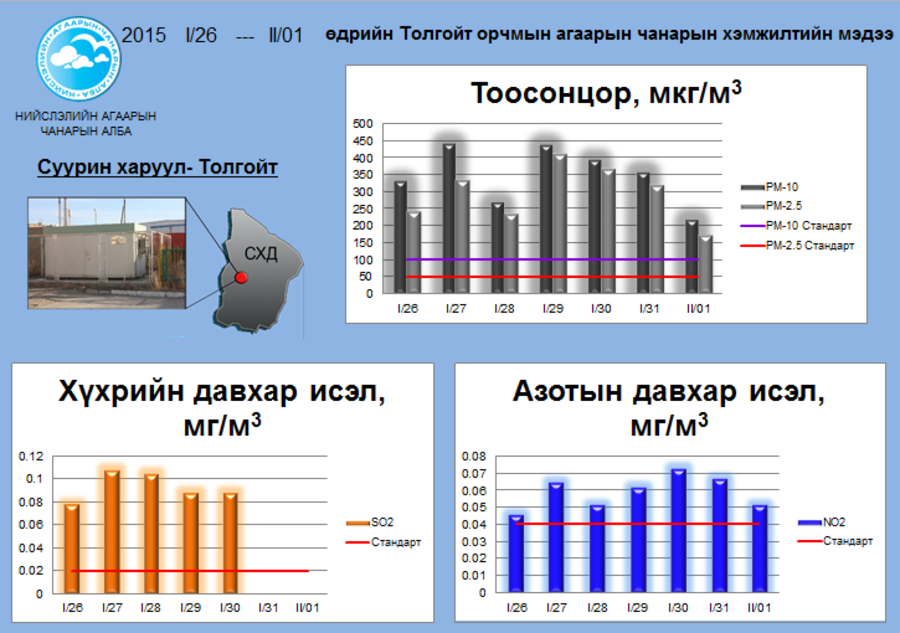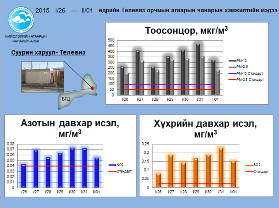 Агаар бохирдуулагч үндсэн дөрвөн бодисын өнгөрсөн долоо хоногийн хэмжилтийн дүнгээс харахад Азотын давхар исэл (NO2)-ийн хамгийн их агууламж 01.30-нд Толгойт орчимд 0.073 мг/м3 буюу хүлцэх хэмжээнээс 1.8 дахин их, Хүхрийн давхар исэл(SO2) -ийн хамгийн их агууламж 01.31-нд Телевиз орчимд 0.23 мг/м3 буюу хүлцэх хэмжээнээс 11.5 дахин их, Том ширхэгт тоосонцор (PM10)-ын хамгийн их агууламж 01.31-нд Телевиз орчимд 474.03 мкг/м3 буюу хүлцэх хэмжээнээс 4.7 дахин их, Нарийн ширхэгт тоосонцор(PM2.5)-ын хамгийн их агууламж 01.29-нд Толгойт орчимд 411.68мкг/м3 буюу хүлцэх хэмжээнээс 8.2 дахин их байна гэж Нийслэлийн Агаарын чанарын албанаас мэдээллээ.