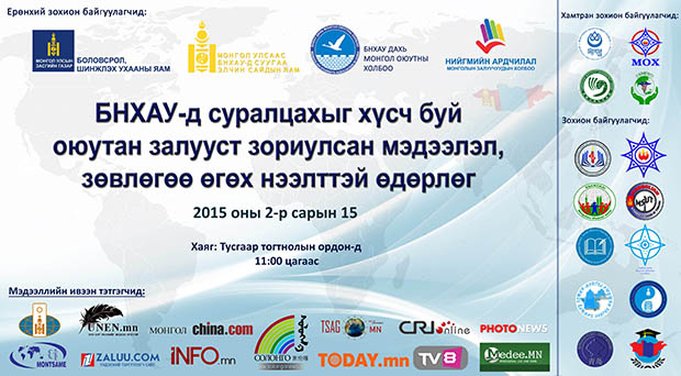 БНХАУ-д суралцахыг хүсч буй та бүхэнд зориулсан мэдээлэл, зөвлөгөө өгөх нээлттэй өдөрлөг энэ сарын 15-ны өдөр 11-17 цагийн хооронд “Тусгаар тогтнол”-ын ордонд болно. Тус арга хэмжээг БНХАУ дахь Монгол Оюутны Холбоо хоёр дахь жилдээ санаачлан Боловсрол Соёл Шинжлэх Ухааны Яам, Монгол Улсаас БНХАУ-д суугаа элчин сайдын яам, Монголын Залуучуудын Холбоо, Нийгмийн Ардчилал Монголын Залуучуудын Холбоо, Монголын Оюутны Холбоотой хамтран зохион байгуулж байна.