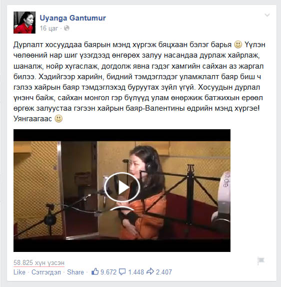 Тэрбээр “Дурлалт хосууддаа баярын мэнд хүргэж бяцхаан бэлэг барья. Үүлэн чөлөөний нар шиг үзэгдээд өнгөрөх залуу насандаа дурлаж хайрлаж, шаналж, нойр хугаслаж, догдолж явна гэдэг хамгийн сайхан аз жаргал билээ. Хэдийгээр харийн, бидний тэмдэглэдэг уламжлалт баяр биш ч гэлээ хайрын баяр тэмдэглэхэд буруутах зүйл үгүй. Хосуудын дурлал үнэнч байж, сайхан монгол гэр бүлүүд улам өнөржиж батжихын ерөөл өргөж залуустаа гэгээн хайрын баяр-Валентины өдрийн мэнд хүргэе! Уянгаагаас” хэмээн бичжээ.